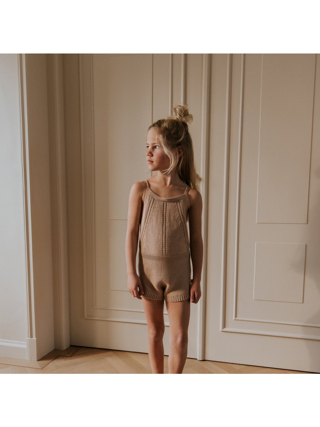 Elegantní pletený overal pro holčičky je dokonalou volbou na teplé letní dny. Vyrobený ze 100% organické bavlny s certifikací GOTS a Oekotex®, je nejen šetrný k dětské pokožce, ale také k přírodě. Volný střih, krátké nohavičky a otevřená záda zajišťují maximální pohodlí a svěžest během horkých dnů.